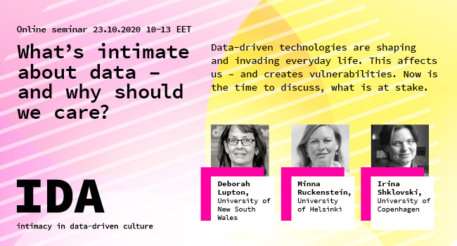 Join us for a Zoom spectacle on the intimacies of data on October 23 with Deborah Lupton, Minna Ruckenstein and Irina Shklovski! Organized by the Strategic research Council consortium, Intimacy in Data-Driven Culture and open for all: follow the link here. Talks will also be recorded and uploaded on our site for later viewing.