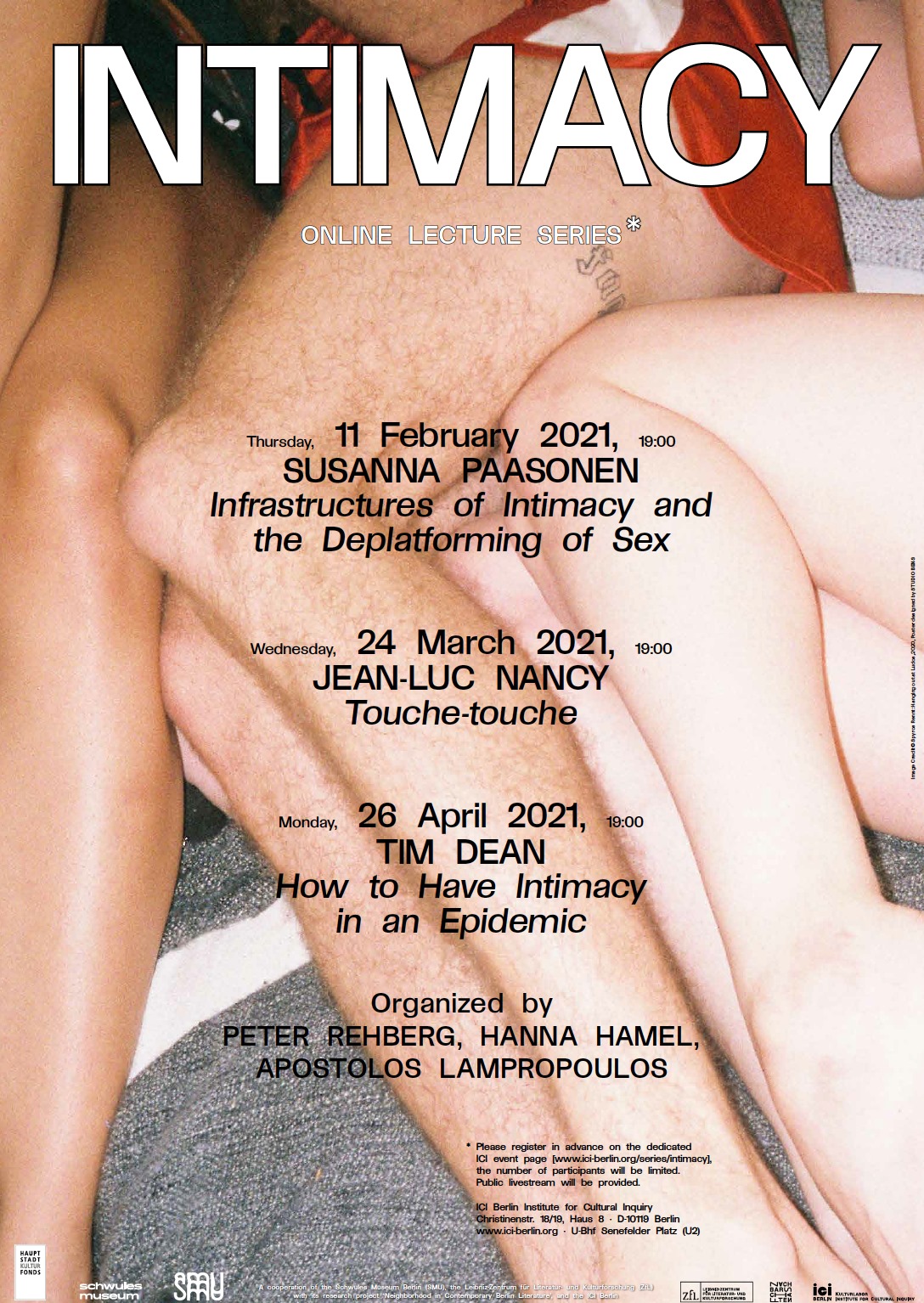 Join us February 11, 7pm CET, for a Zoom chat on sex and online platforms, under the title “Infrastructures of Intimacy and the Deplatforming of Sex”. Mine is the first talk in INTIMACY series organized collaboratively by Schwules Museum, Zentrum für Literatur- und Kulturforschung (ZfL), and ICI Berlin — with Jean-Luc Nancy and Tim Dean coming up in March and April. For registration go to the ICI Berlin website: https://www.ici-berlin.org/events/susanna-paasonen/